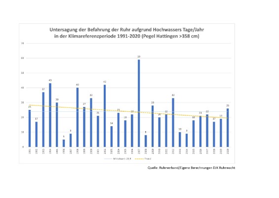 Die Auswertung der Daten des Ruhrverbands für die Klimareferenzperiode 1991–2020 bestätigt diesen Trend: Die Zahl der Hochwassertage, an denen ein Befahrungsverbot galt, ist im statistischen Mittel eindeutig zurückgegangen.